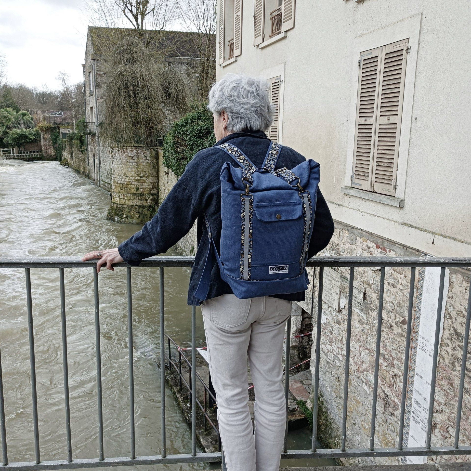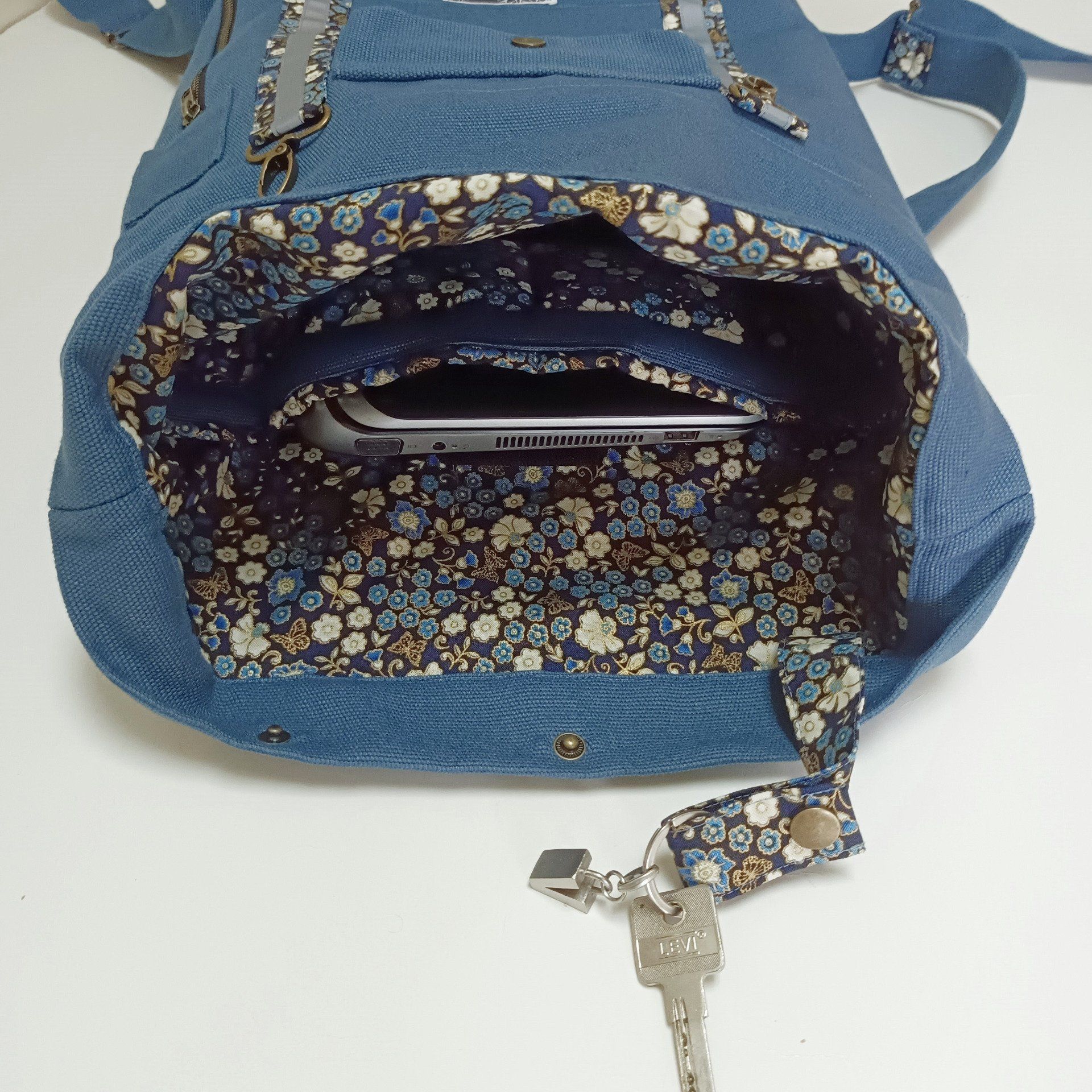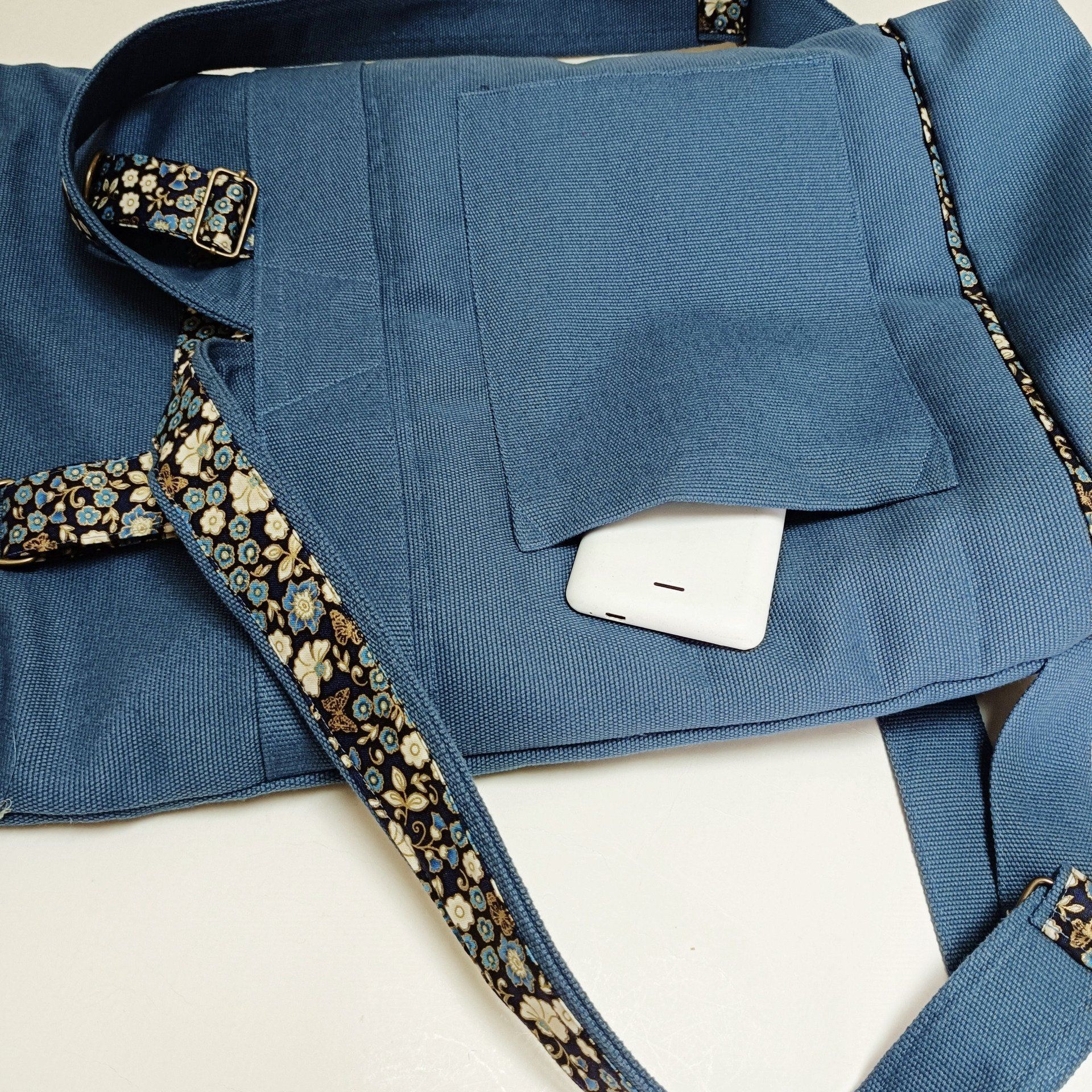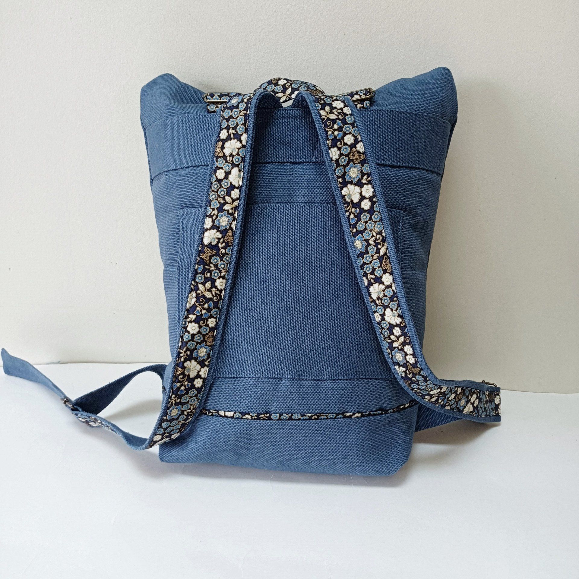 Sac à dos coursier toile coton Thèbes bleu acier / fleurs - Fait main en France