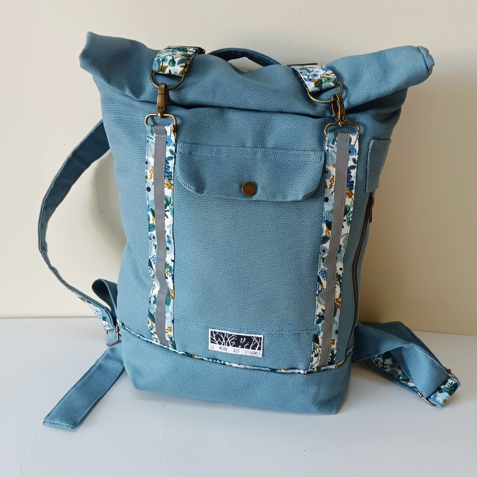 Sac à dos coursier toile coton Thèbes bleu clair / fleurs - Fait main en France