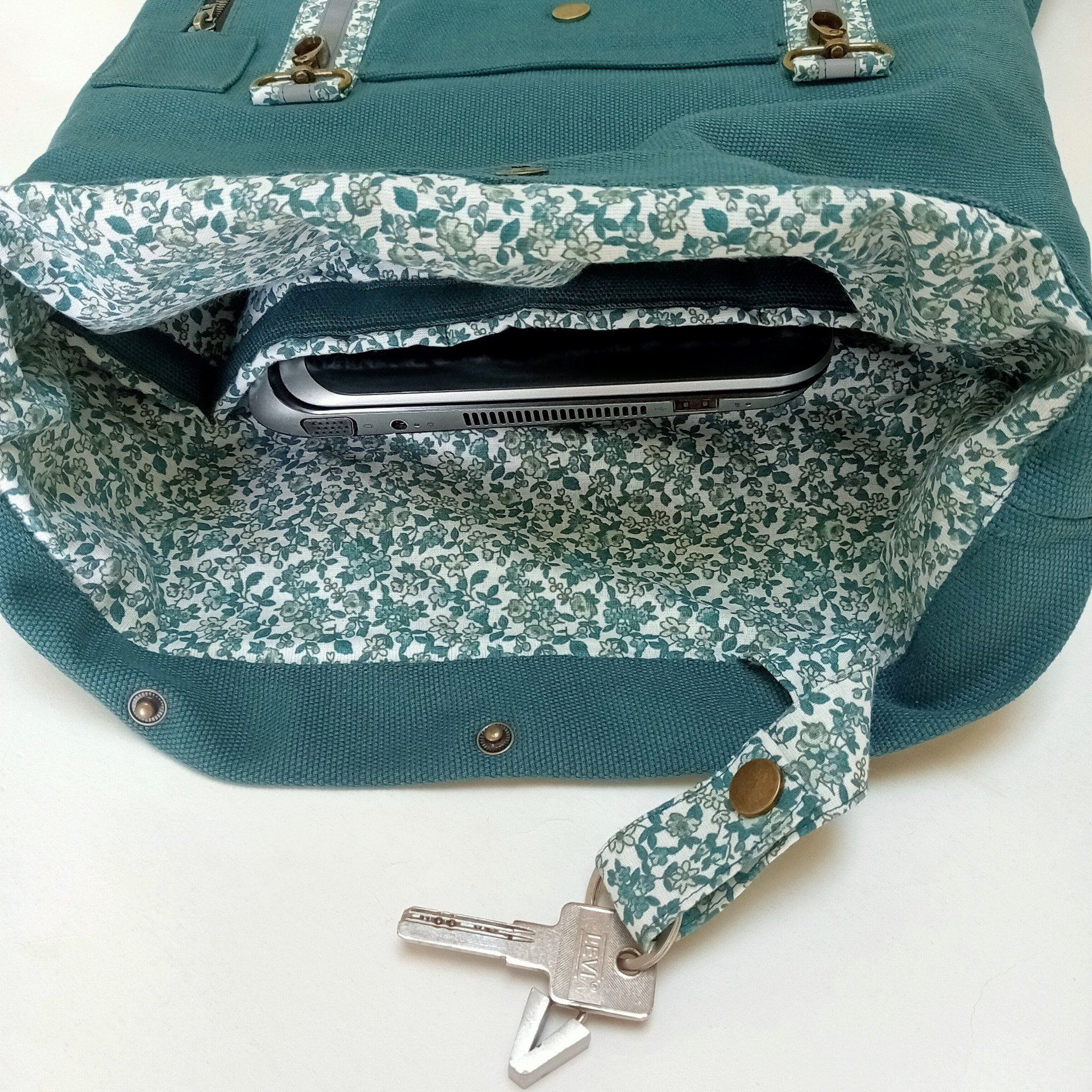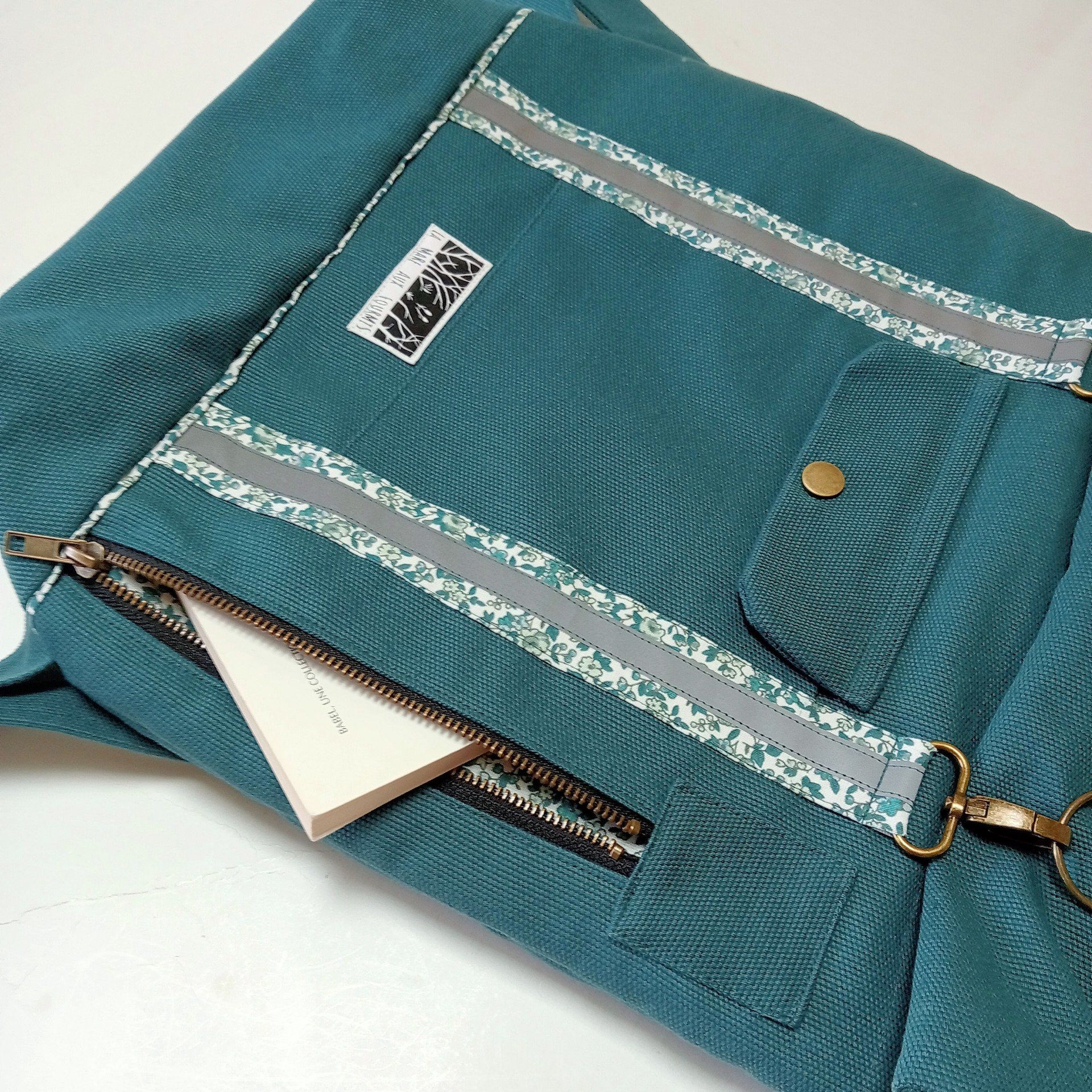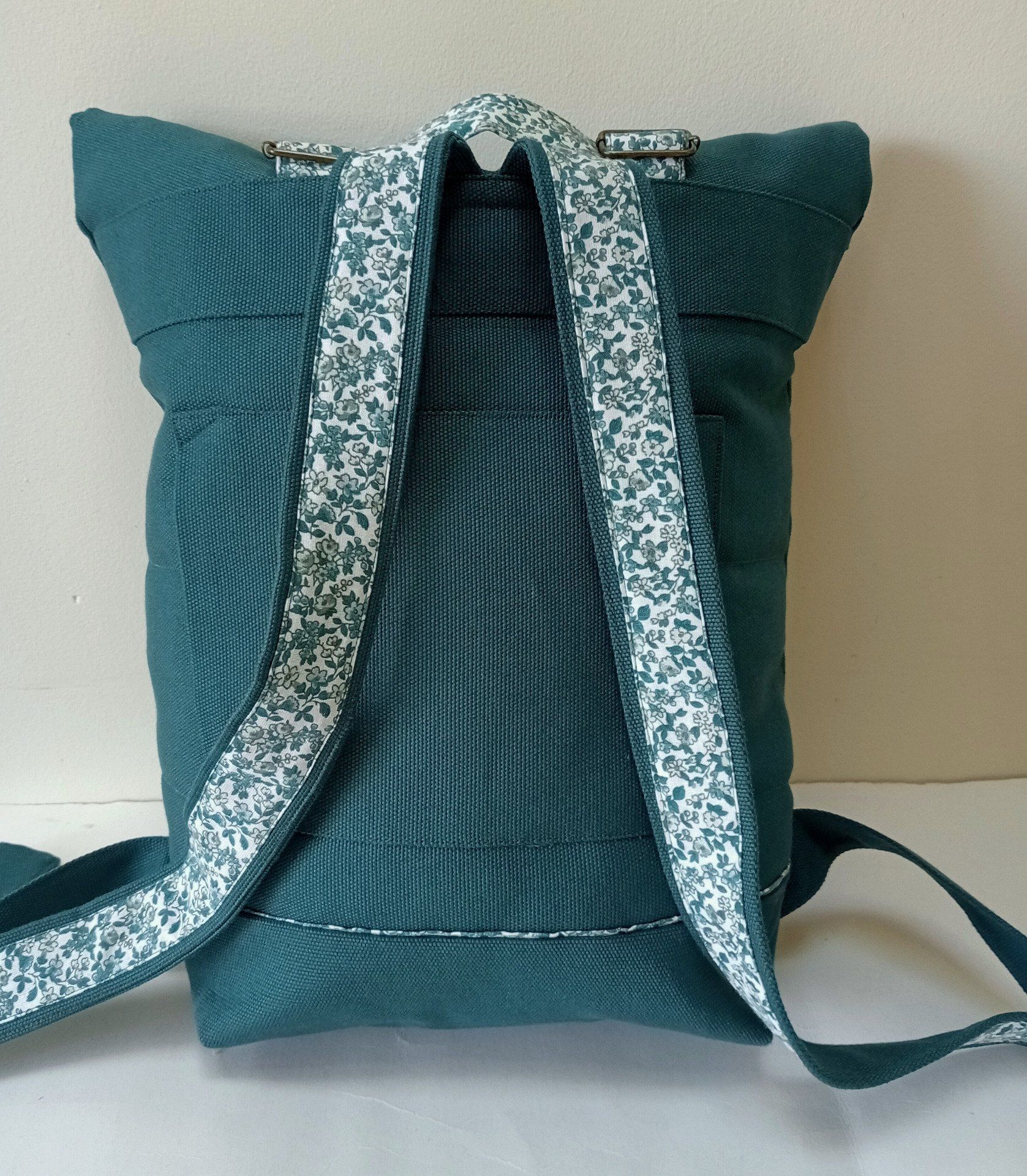 Sac à dos coursier toile coton Thèbes vert pin / fleurs - Fait main en France