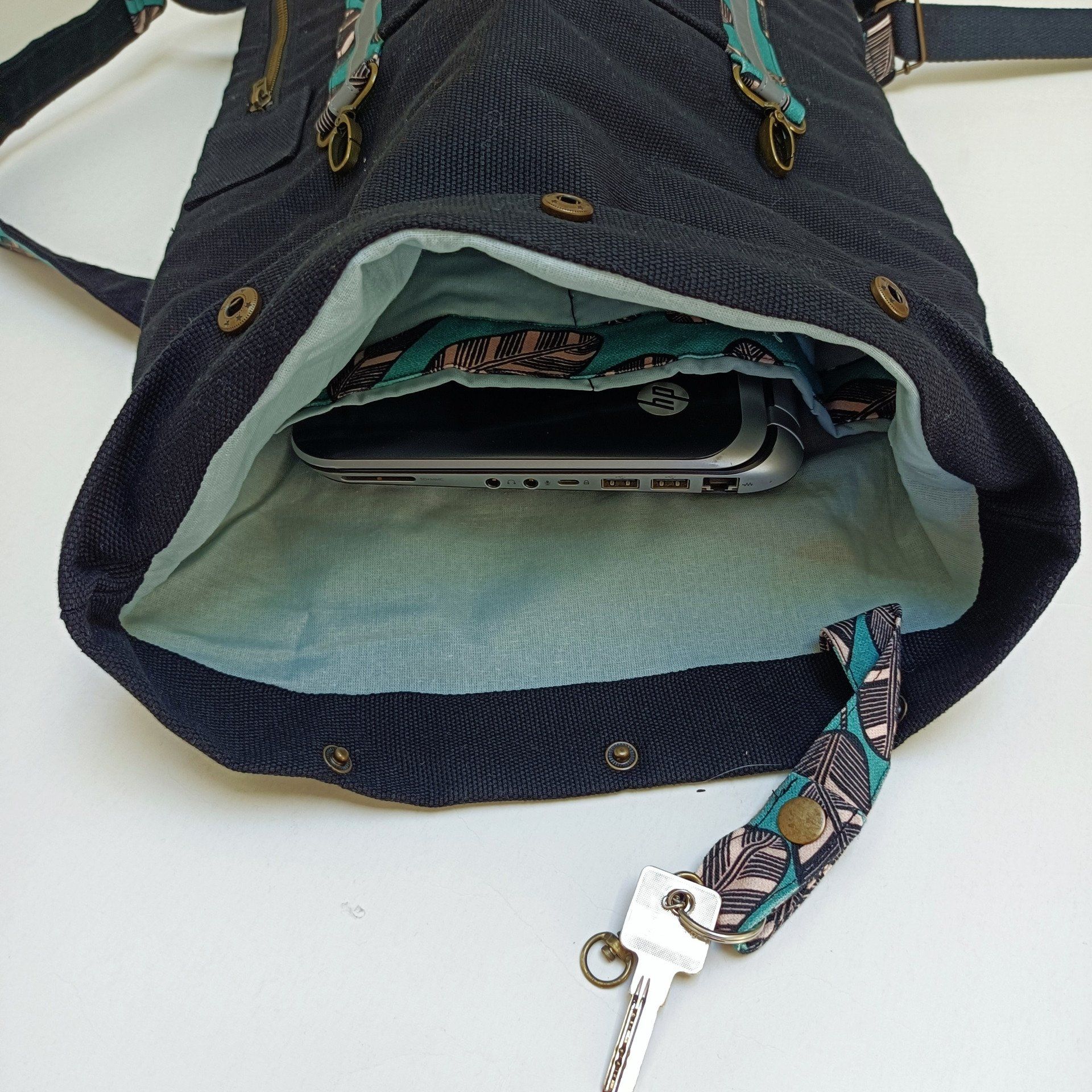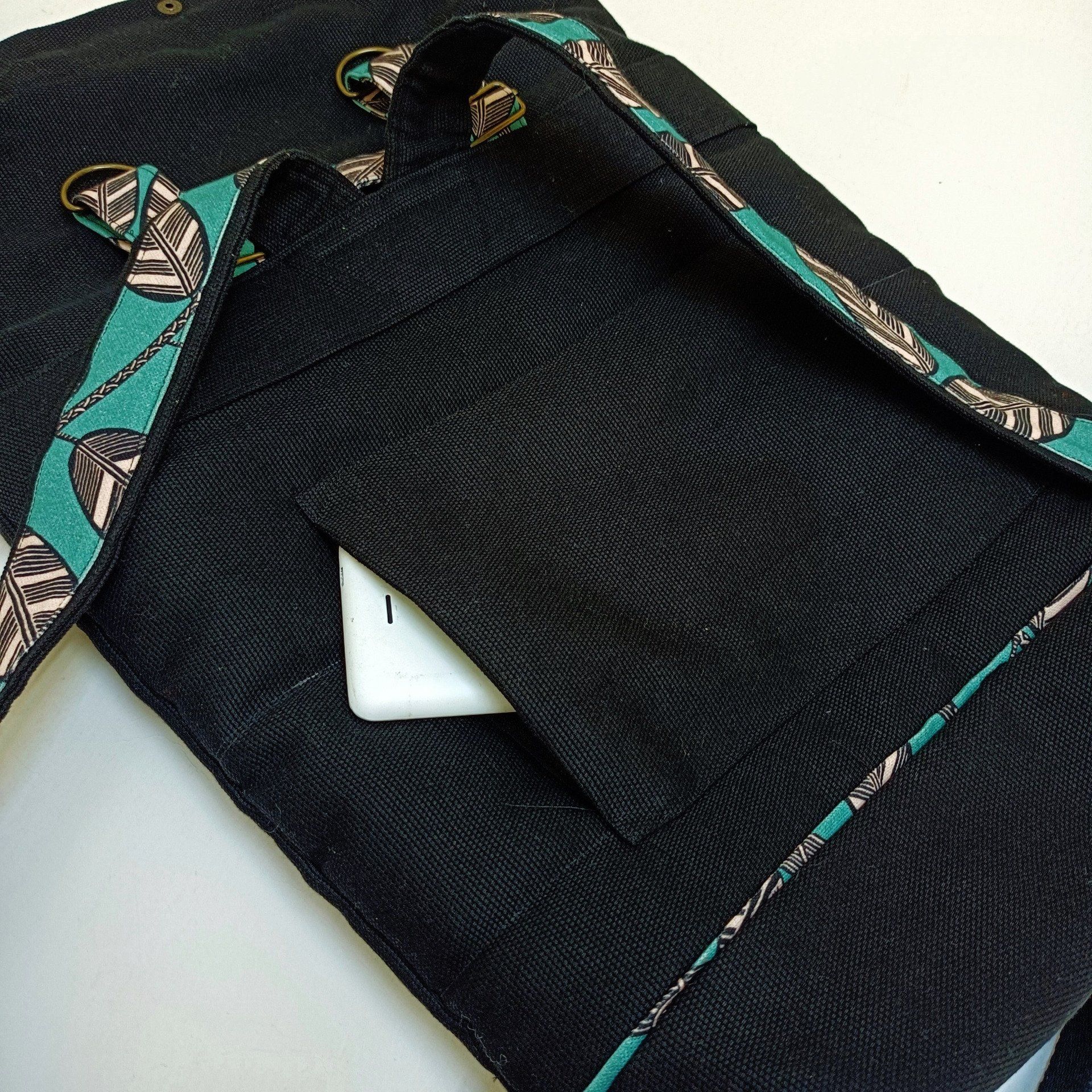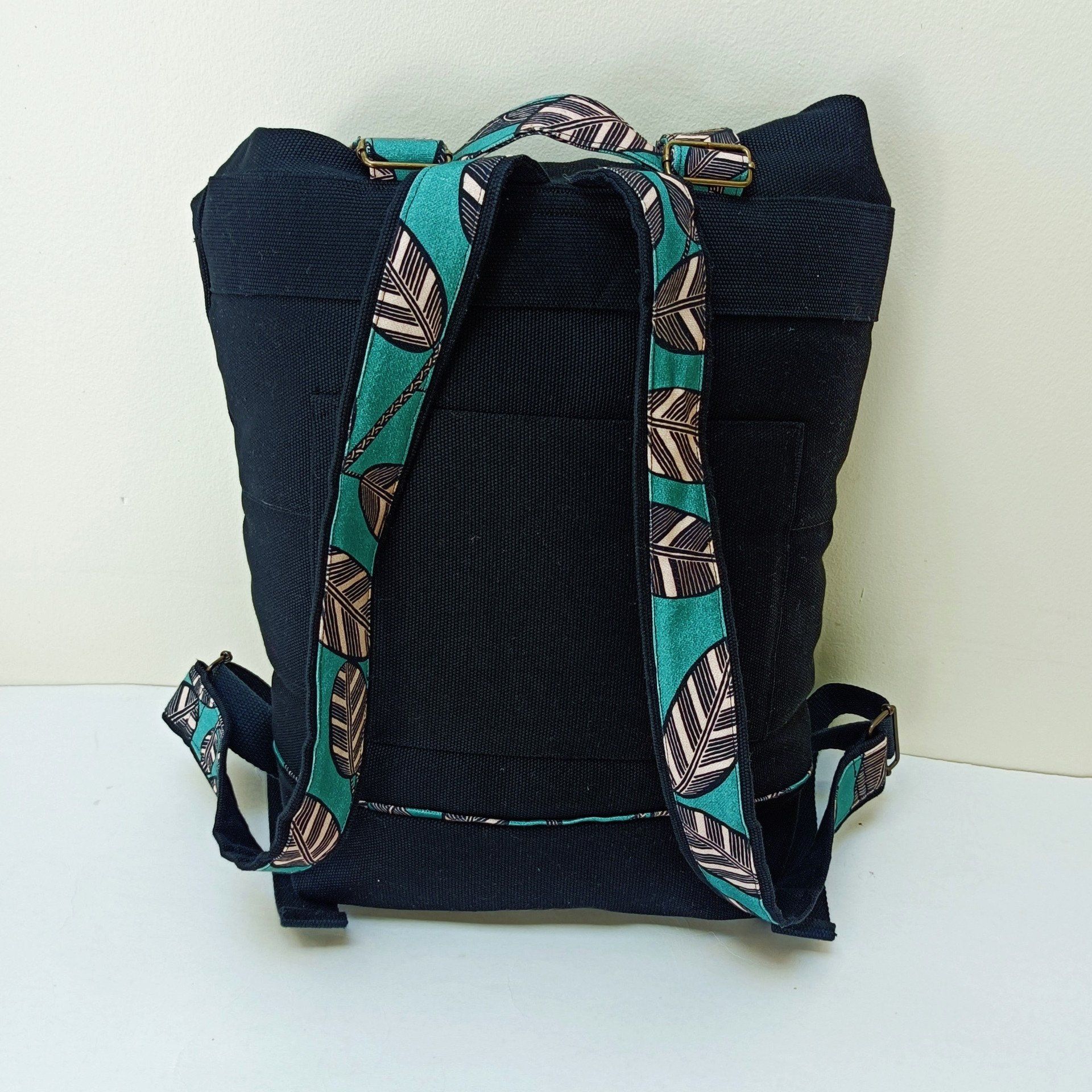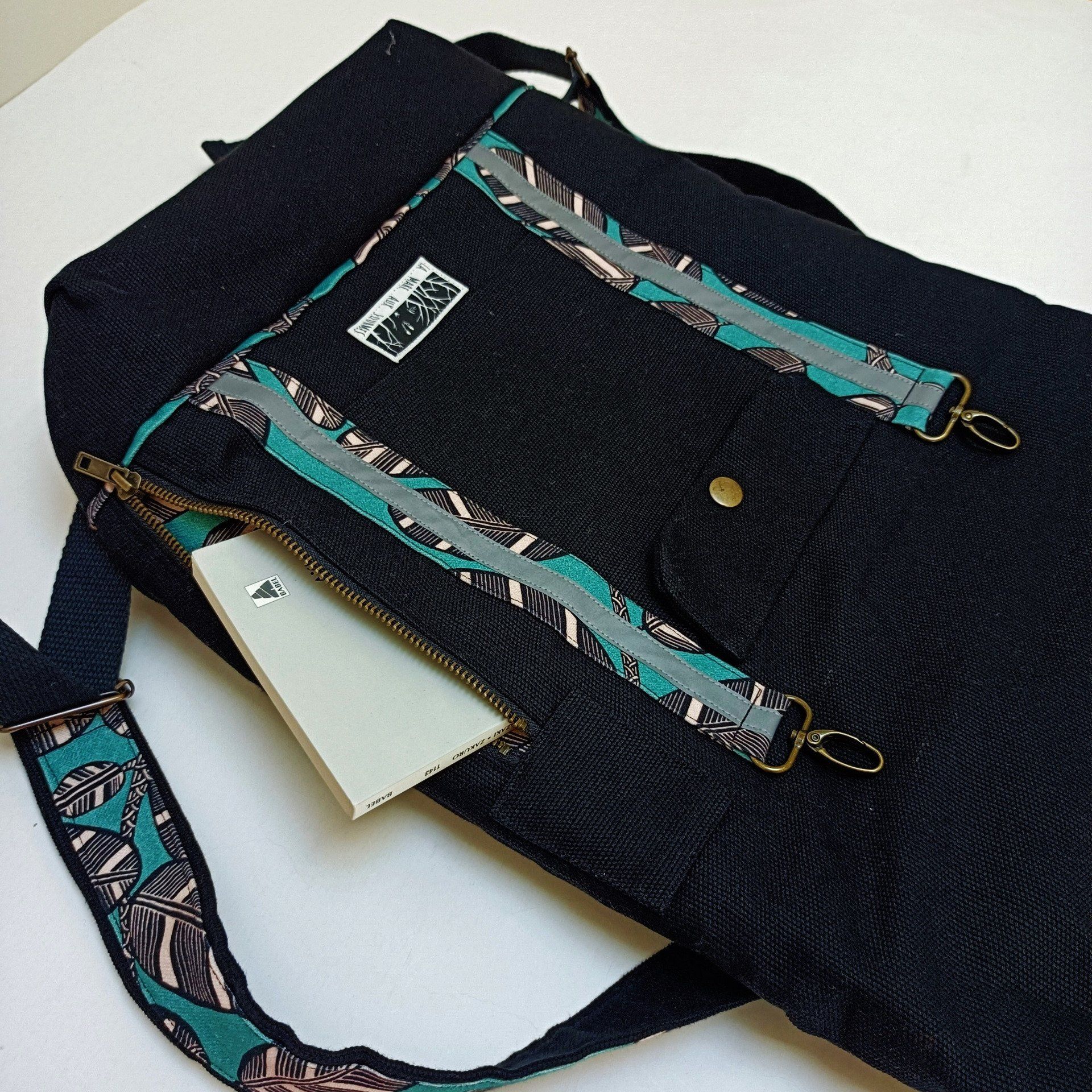 Sac à dos coursier toile Thèbes noire - Coton Elis vert de maison Thévenon - Fait main en France