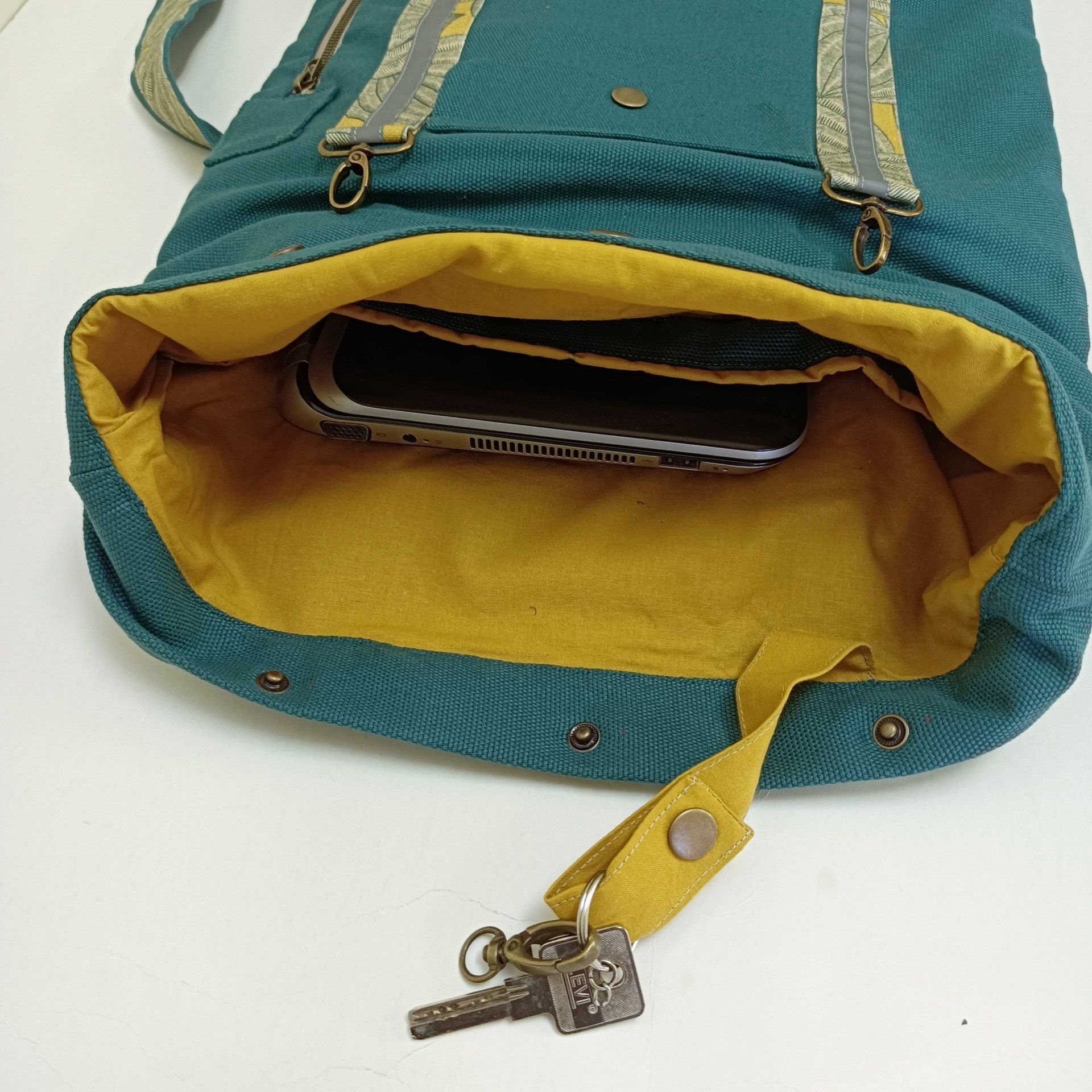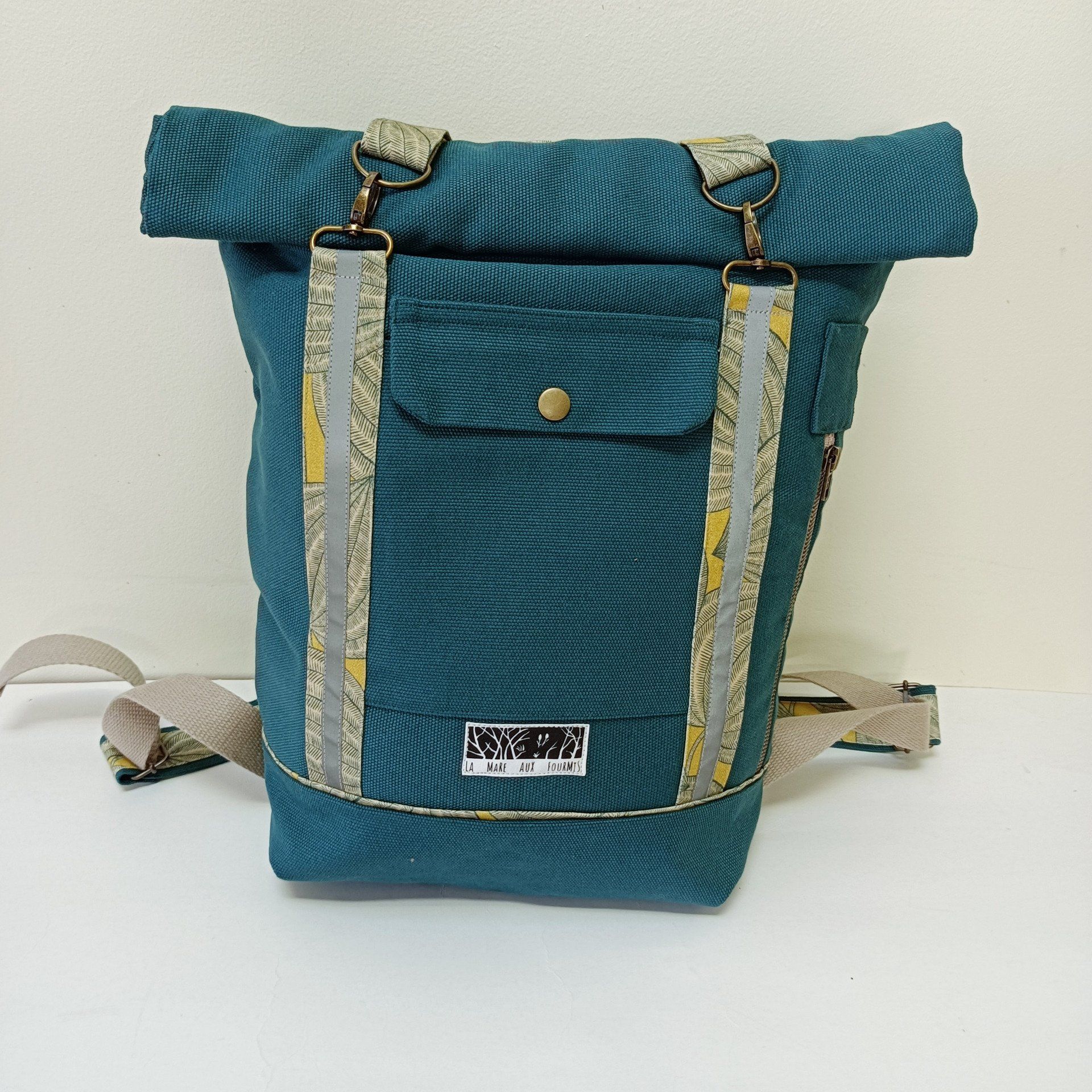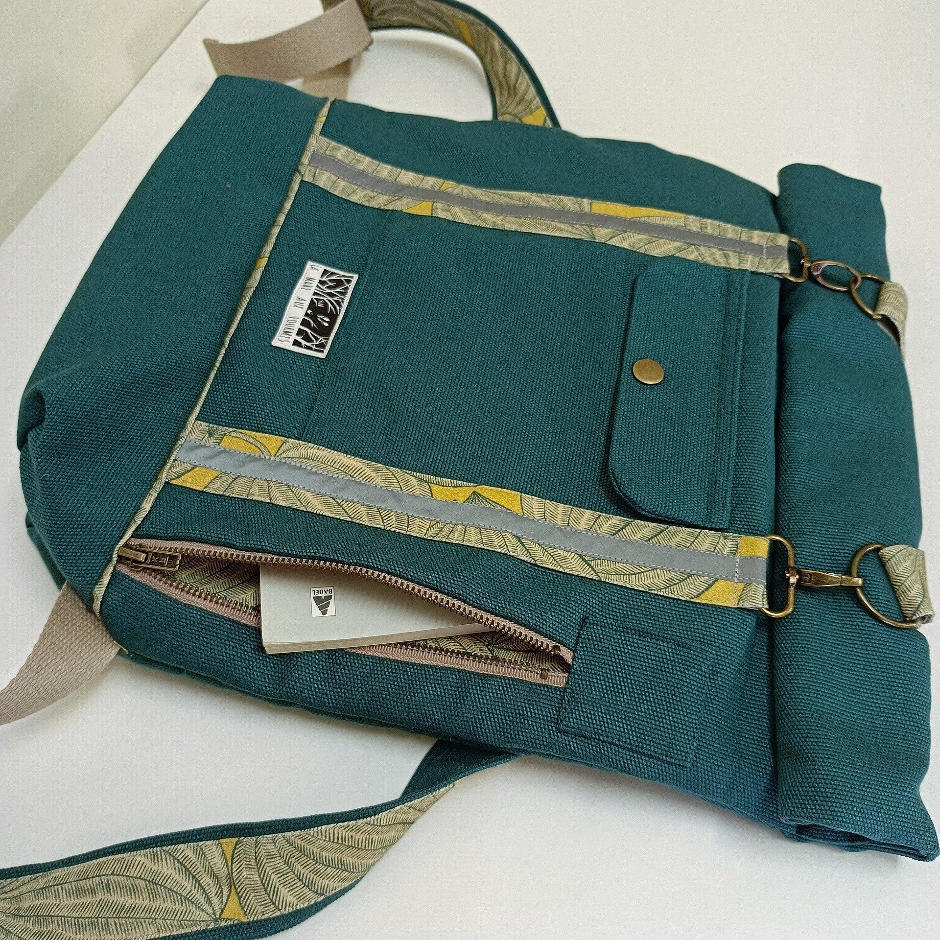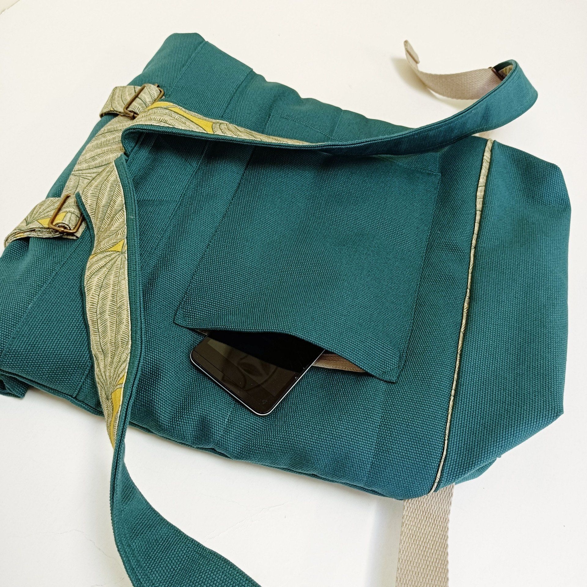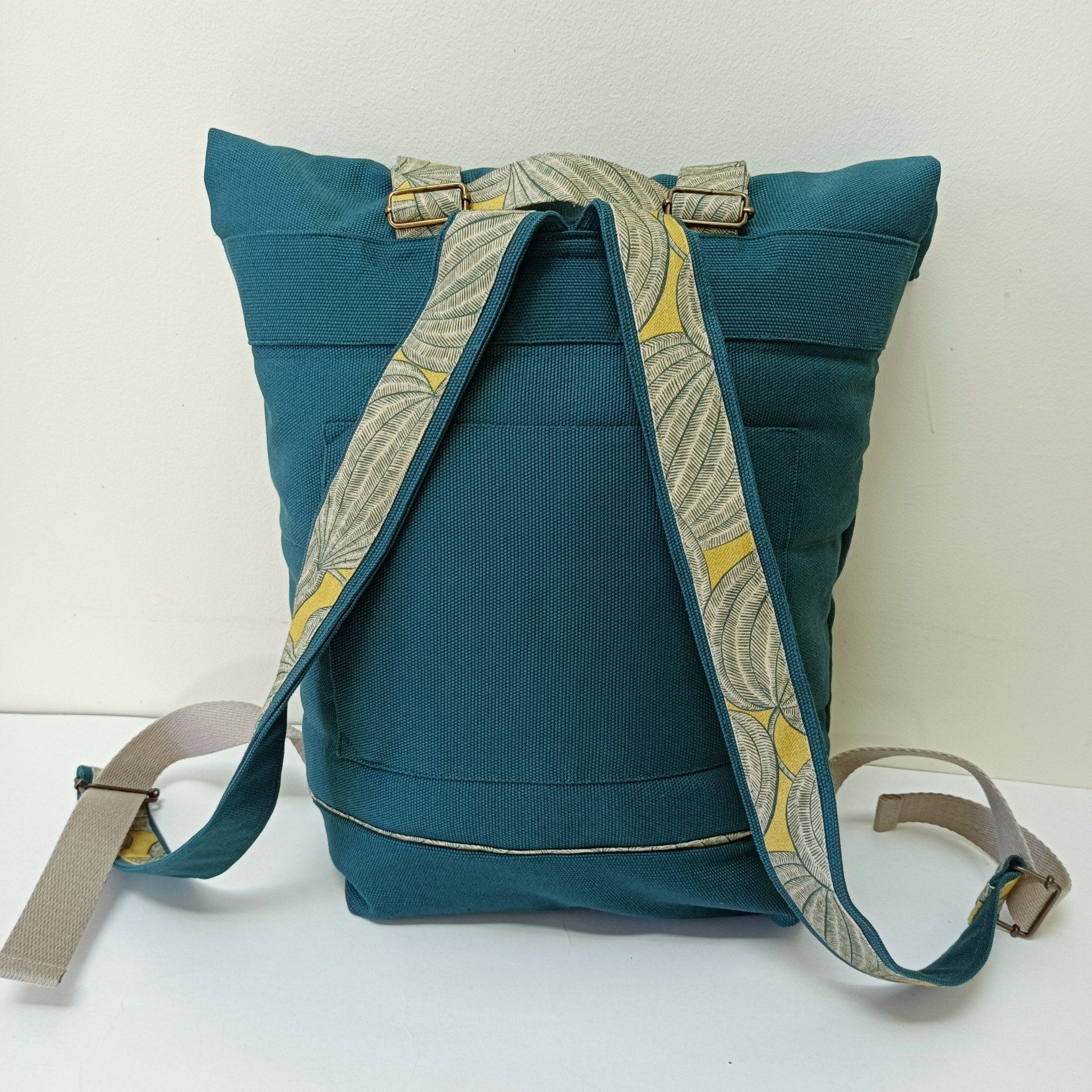 Sac à dos coursier toile Thèbes vert-bleu - Coton imprimé Harvest de Maison Thévenon - Fait main en France