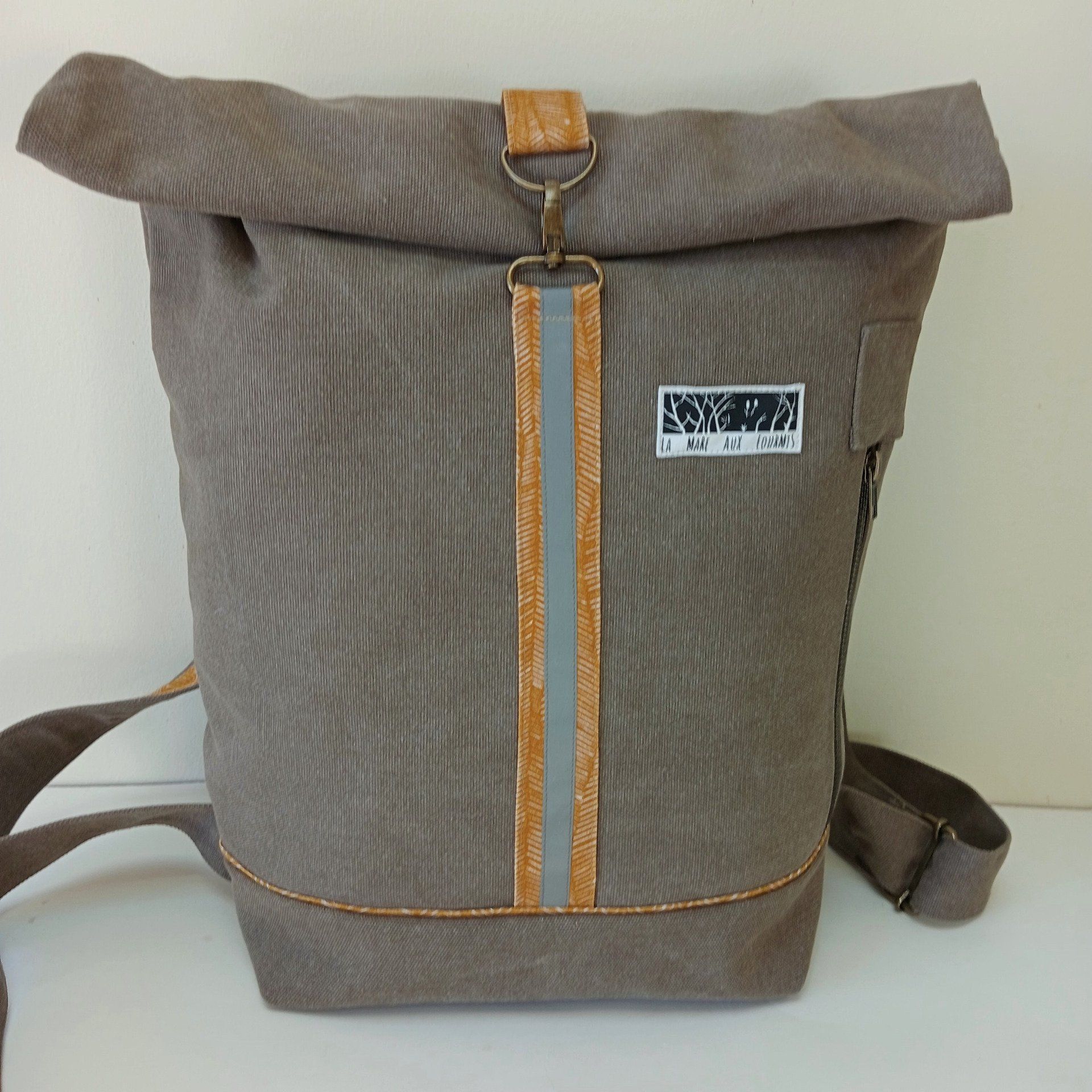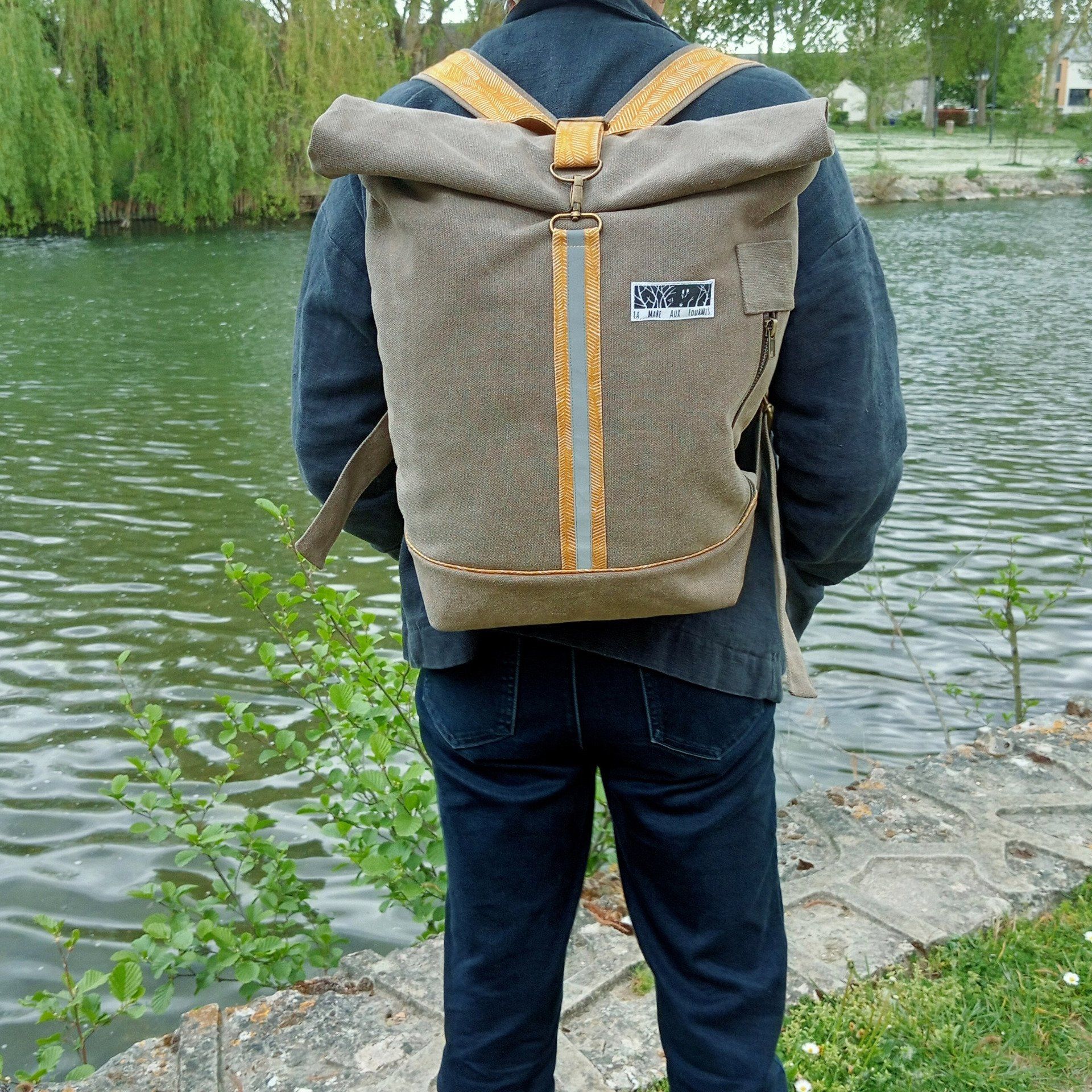 Sac à dos toile Cayman zip top - Toile Cayman taupe - jaune- Fait main en France