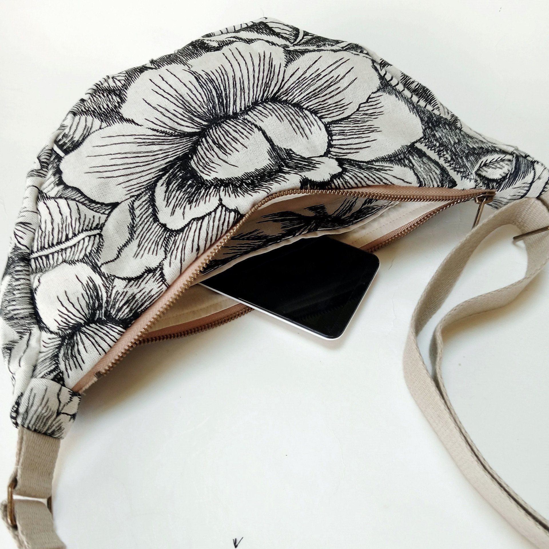 Petit sac demi-lune - Lin brodé écru/noir de Maison Thévenon - Fait main en France